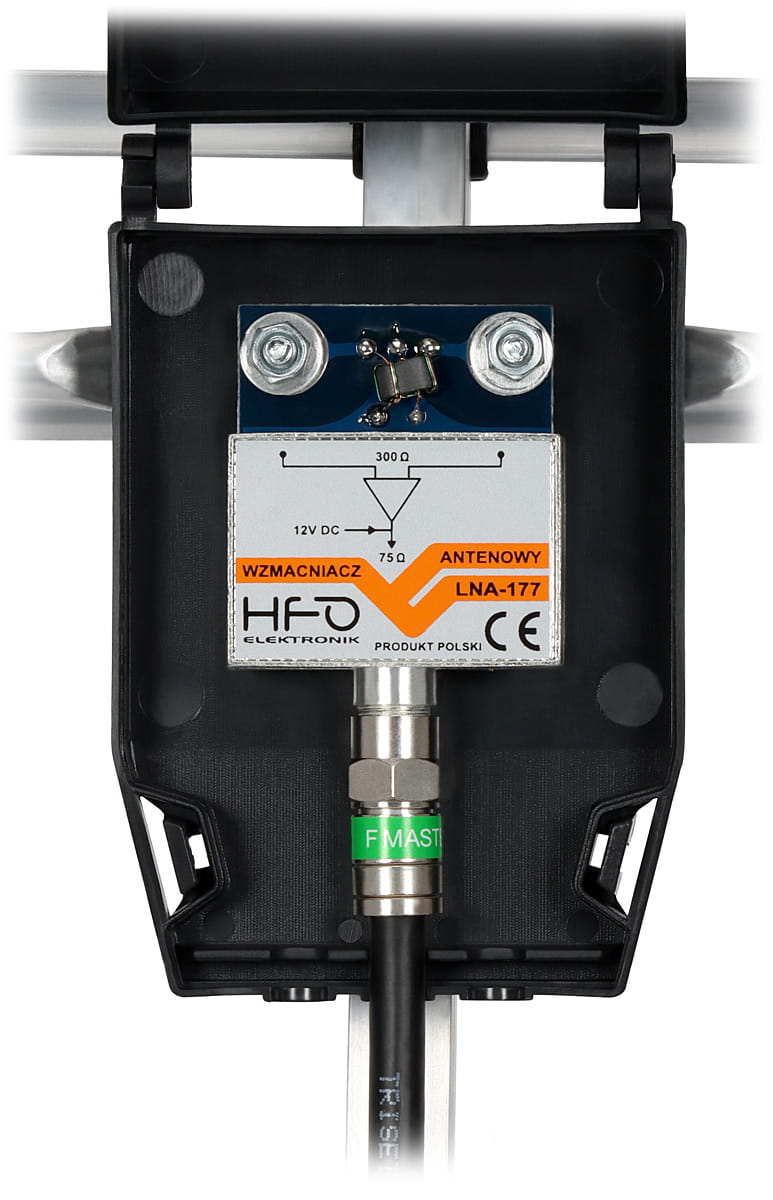 W puszce anteny znajduje się wzmacniacz LNA-177 o wzmocnieniu 30 dB. Przewód antenowy mocowany jest do niego za pomocą złącza F.
