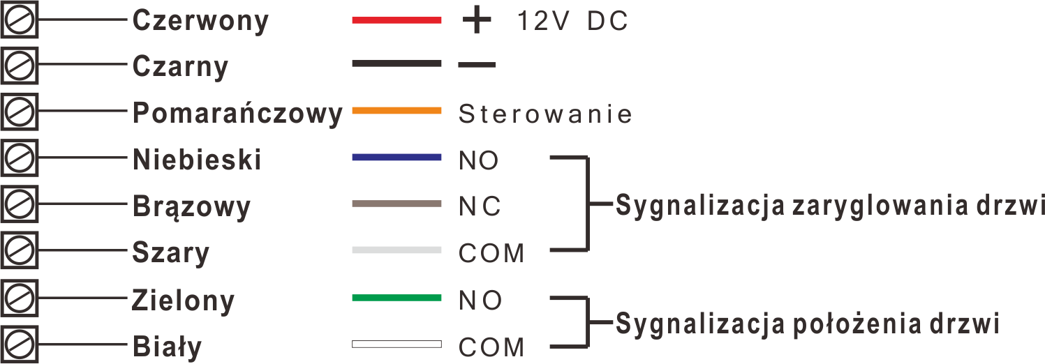 Jest to dodatkowe wyjście sygnalizacyjne (styk NO/NC) działające tak jak dioda sygnalizacyjna LED. Stan NO pozostaje zwarty podczas zablokowania drzwi (dioda świeci na czerwono), rozwarty w przypadku braku napięcia lub jeżeli drzwi są odblokowane (dioda nie świeci). Stan NC pozostaje rozwarty podczas zablokowania drzwi (dioda świeci na czerwono), zwarty w przypadku braku napięcia lub jeżeli drzwi są odblokowane (dioda nie świeci).