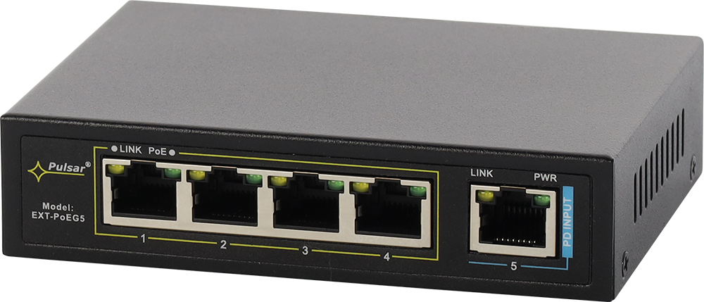 Extender EXT-POEG5 to urządzenie przeznaczone do zwiększenia odległości przesyłu zasilania PoE oraz danych Ethernet za pomocą skrętki UTP kat. 5e o kolejne 100m. Extender jest zasilany ze switcha PoE (wejście PoE PD INPUT), lub z zasilacza poprzez gniazdo zasilania DC. Napięcie wyjściowe oraz dane dostępne są na wyjściach PoE OUT, do których należy podłączyć kamery lub inne urządzenia IP wykorzystujące zasilanie PoE. Maksymalny prąd obciążenia wynosi 0,6 A/port – sumarycznie 0,8 A (w przypadku zasilania poprzez PoE PD INPUT) lub 1,15 A (w przypadku zasilania poprzez złącze DC). Urządzenie przeznaczone jest do pracy w sieciach 10/100/1000 Mb/s.