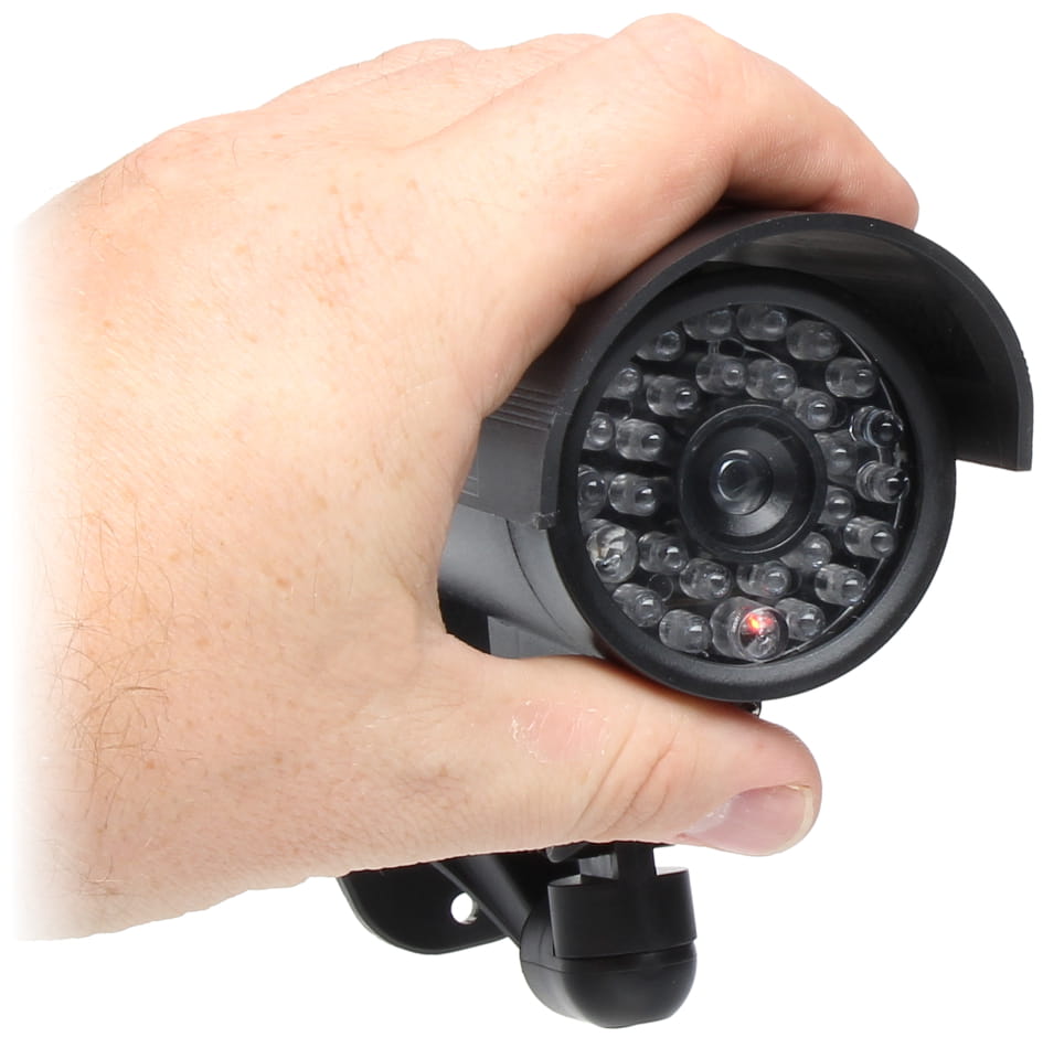 Posiada migającą, czerwoną diodę LED. Takie rozwiązanie powoduje, że atrapa zwraca na siebie uwagę i łatwo można ją dostrzec. Przewód zasilania wchodzący poprzez uchwyt do ściany sprawia, że nie sposób jej odróżnić od zwykłej kamery.