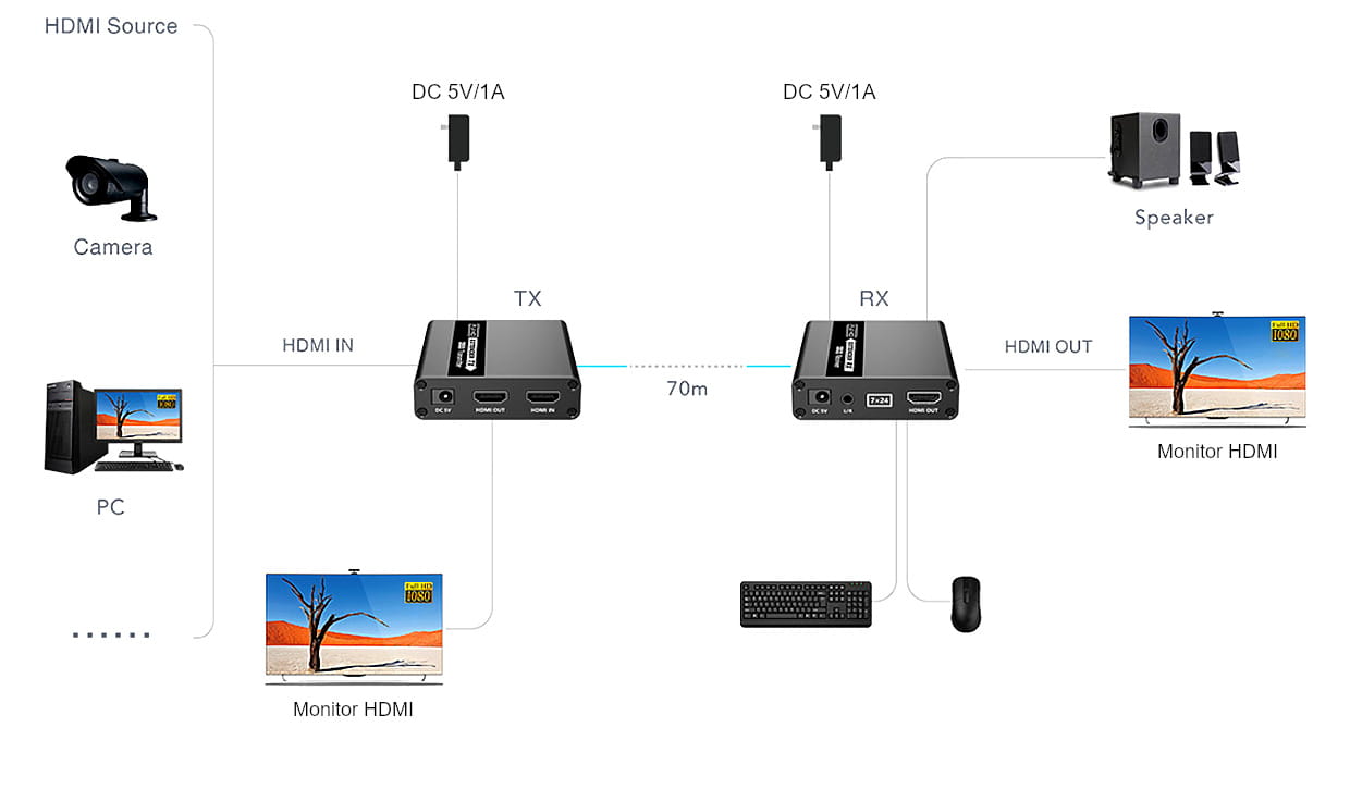 Konwerter HDMI HDMI+USB-EX-70 marki Signal umożliwia przesłanie sygnału HDMI na duże odległości przy wykorzystaniu skrętki komputerowej kategorii 6 lub wyższej. Urządzenie transmituje bezstratny obraz obsługują HDR, DTS. Dodatkowo, konwerter posiada wbudowany przedłużacz USB. W przypadku zastosowania konwerterów HDMI+USB-EX-70 nie występuje opóźnienie sygnału (obraz i dźwięk) na wejściu i wyjściu zestawu. Cecha ta może być szczególnie istotna w przypadku chęci wykorzystania zdalnego sterowania urządzeniami poprzez wbudowany przedłużacz USB.