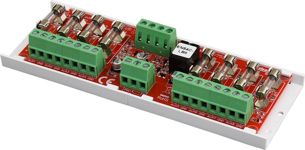 Wejście IN1 dostarcza zasilanie do wyjść AUX1-AUX4 natomiast wejście IN2 do wyjść AUX5-AUX8. Każde wyjście AUX posiada zabezpieczenie przeciwzwarciowe (SCP) w postaci bezpiecznika topikowego F0,5 A (istnieje możliwość założenia bezpieczników max. F1 A – brak w zestawie).
