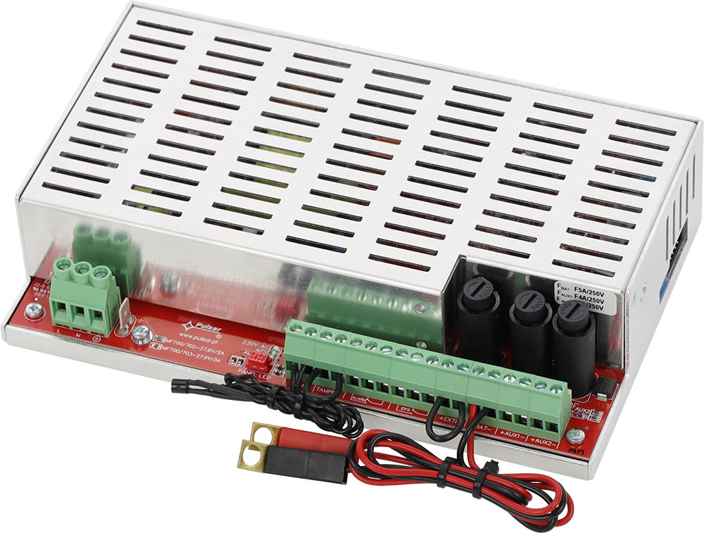EN54M-2A7 to moduł impulsowego zasilacza buforowego marki Pulsar. Przeznaczony jest do systemów sygnalizacji pożarowej, systemów kontroli rozprzestrzeniania dymu i ciepła, oraz innych urządzeń przeciwpożarowych i automatyki ppoż wymagających bezprzerwowego zasilania 27.6V DC (24V DC +/-15%).