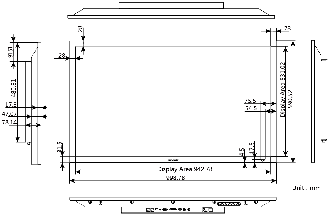 Monitor przemysłowy 43" Hikvision. Rozdzielczość 1920x1080, kąty widzenia: 178° (H) / 178° (V). Wielkość piksela 490.05x490.05um, jasność: 500 nit, kontrast 100000: 1, czas reakcji: 8 ms. Wejścia: 1xHDMI, 1xVGA, 1xDVI, 1xBNC, 1xUSB, 1XRS-232, 1xAudio. Wyścia: 1xBNC, 2xAudio, 1xRS-232. Mocownanie VESA 400x300mm. Przystosowany do pracy 7x24. Wymiary: 998.78 x 590.52 x 78.24 mm, waga około 21 Kg. Zasilanie 240VAC.