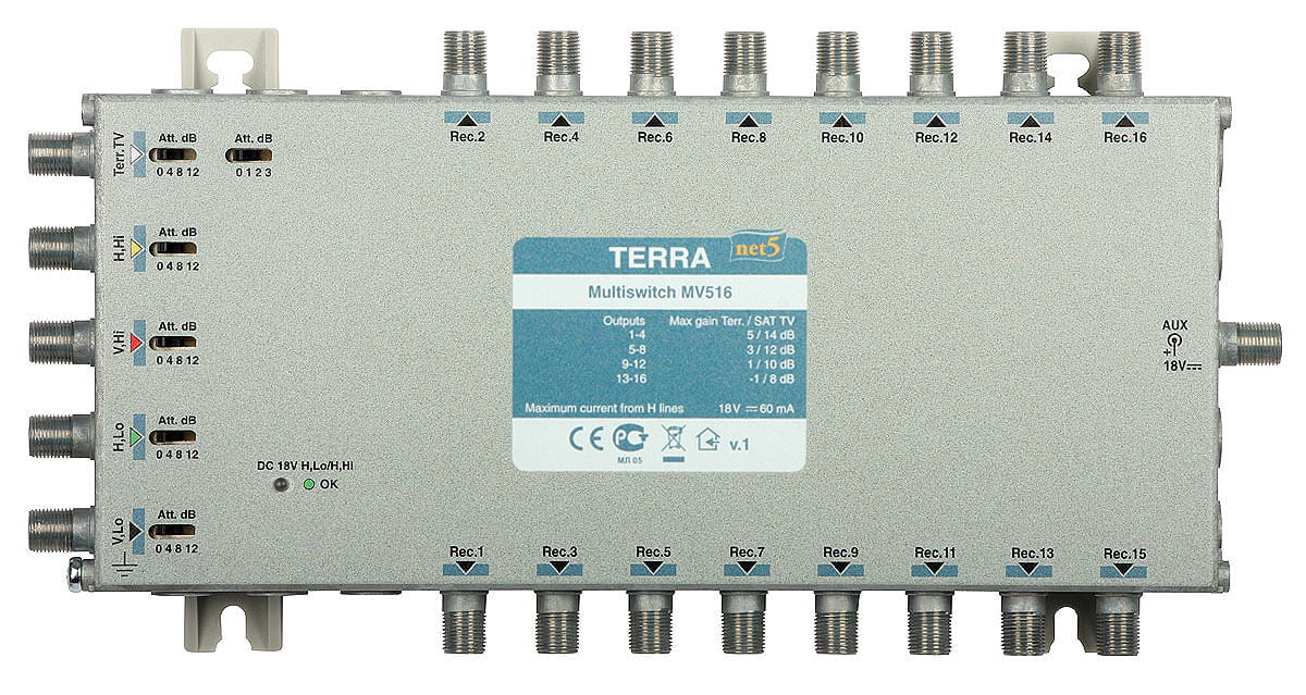 ły w sposób umożliwiający pracę w średnich i dużych zbiorczych instalacjach telewizyjnych RTV+SAT. Mogą być również stosowane w mniejszych instalacjach domowych.Multiswitch MV-516 posiada aktywny (wzmacniany) tor telewizji naziemnej oraz satelitarnej. Regulacja poziomu sygnału dla każdego z torów satelitarnych oraz DVB-T odbywa się za pomocą dedykowanych przełączników. Taki sposób konfiguracji zapewnia większą stabilność ustawionych parametrów w stosunku do rozwiązań tradycyjnych, bazujących na potencjometrach.