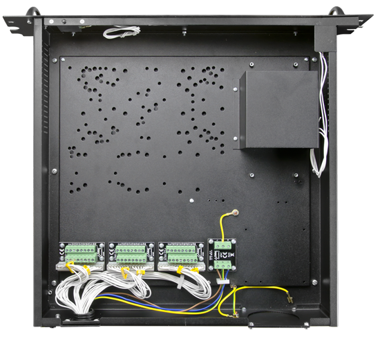 - Wysuwana obudowa wysokości 2U – w tej części montowana jest centrala alarmowa z modułami wejść i wyjść, posiada miejsce na akumulator 7Ah, transformator, wentylator ARAW45 (transformator i wentylator nie są w zestawie).