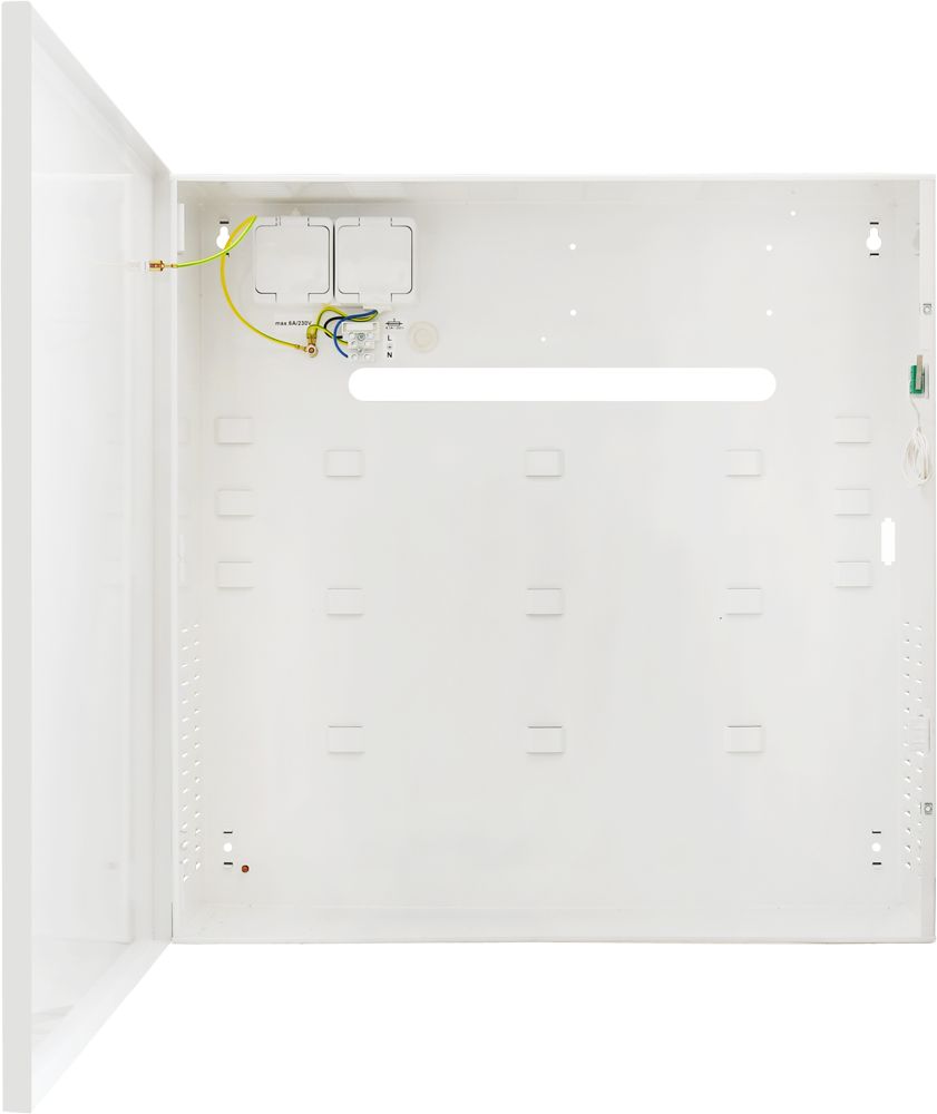 We wnętrzu znajduje się podwójne gniazdo zasilające ~230 V, wraz ze złączem zasilania wyposażonym w bezpiecznik topikowy. Konstrukcja obudowy została dostosowana do wymagań z zakresu ochrony danych osobowych (RODO), które muszą być chronione i bezpiecznie przechowywane (możliwość montażu dwóch zamków o różnym kodzie).