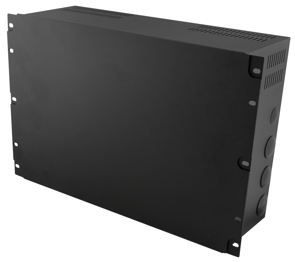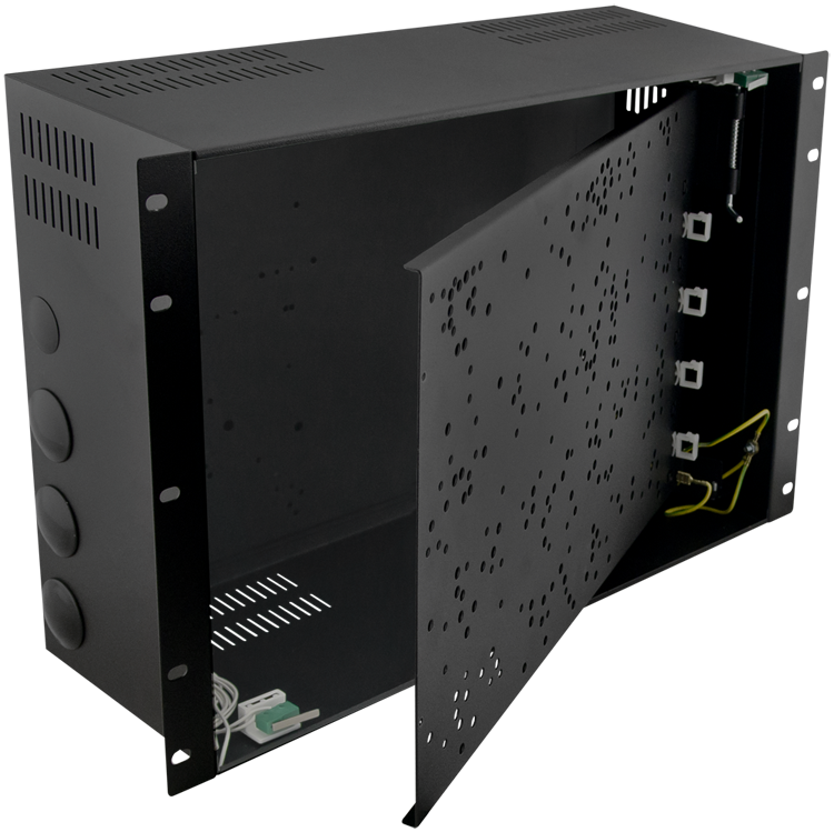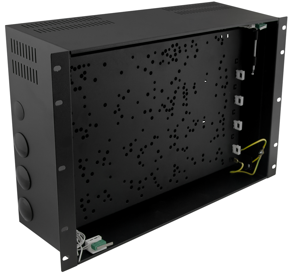 Obudowa metalowa RAWO7 przeznaczona jest do montażu centrali alarmowej wraz z modułami wejść/wyjść w szafach RACK 19″. Obudowa ta posiada demontowaną płytę montażową (I poziom) oraz demontowaną uchylną blachę montażową (II poziom). W obudowie znajduje się miejsce na akumulator 17Ah/12V.