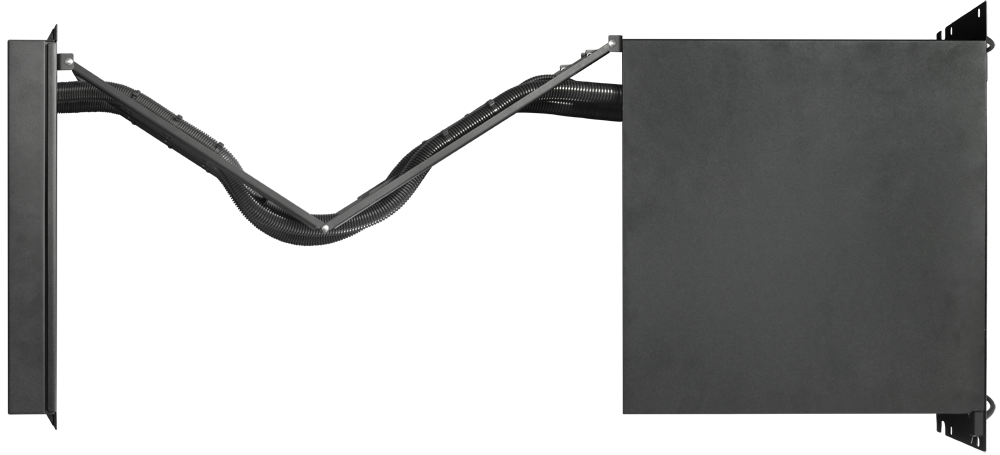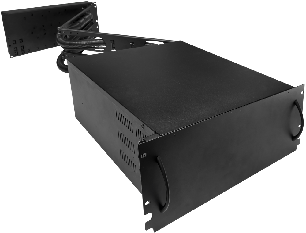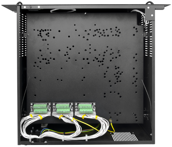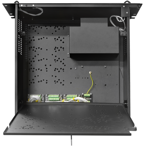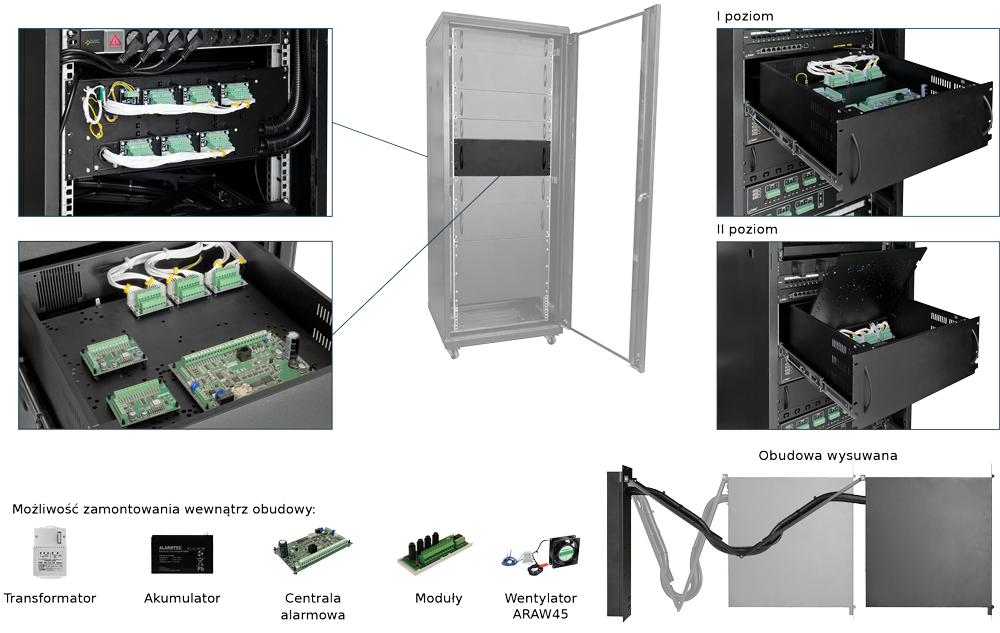 - Wysuwana obudowa wysokości 4U – w tej części montowana jest centrala alarmowa z modułami wejść i wyjść, posiada miejsce na akumulator 17Ah, transformator, wentylator ARAW45 (transformator i wentylator nie są w zestawie).