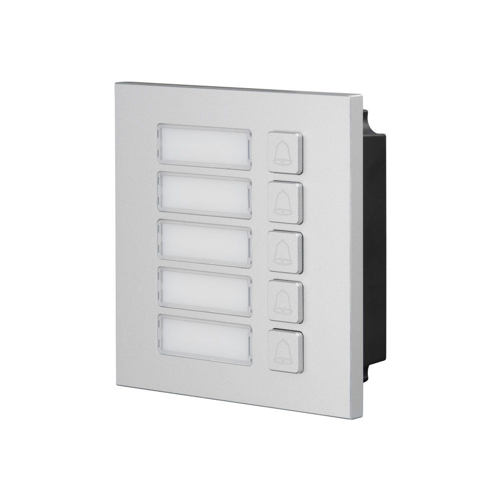 Podwójny moduł z 5 przyciskami wywołania do nowego systemu modułowego IP BCS. Umożliwia rozszerzenie ilości obsługiwanych mieszkań w systemie. Możliwość przypisania dowolnego kodu wywołania (numeru lokalu) do każdego przycisku niezależnie. Front wykonany z aluminium. Przeznaczony do montażu w ramkach dwu lub trzy modułowych BCS-RA2-N oraz BCS-RA3-N. Zasilanie i transmisja danych z moduł kamery BCS-PAN-KAM-N za pomocą dostarczonej wraz z ramką taśmy modułowej.