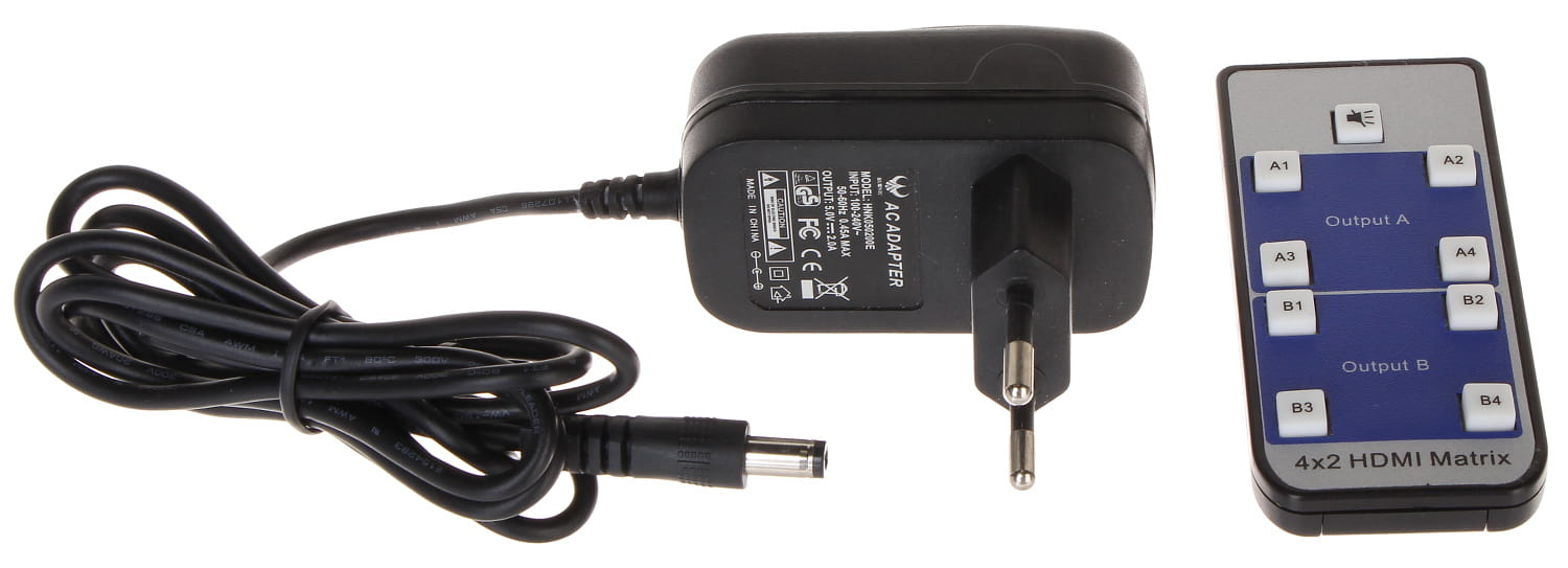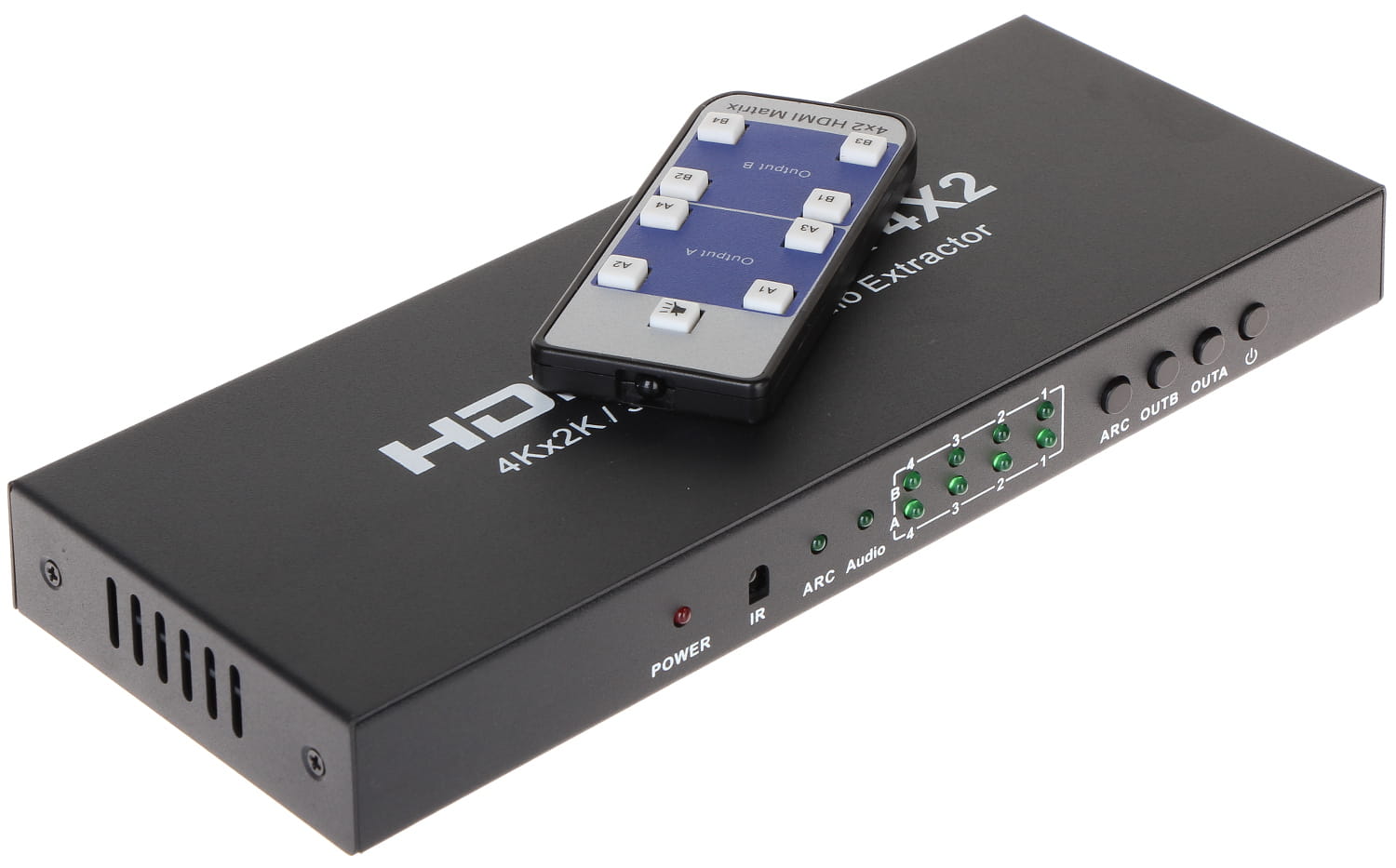Umożliwia dowolne rozprowadzenie sygnału HDMI z 4 wejść na dowolne 2 wyjścia. W komplecie znajduje się pilot.