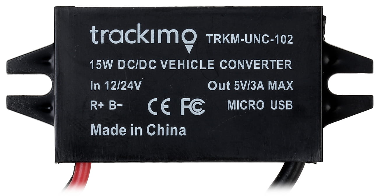 Urządzenie TRACKIMO-12-24V/5V konwertuje napięcie wejściowe do wartości 5V DC. Przewód doprowadzający napięcie 5V DC zakończony jest wtykiem micro USB. Przetwornica jest dedykowana do współpracy z urządzeniami marki Trackimo, niemniej może pełnić funkcję zasilacza samochodowego dla dowolnego urządzenia z możliwością zasilenia przez port micro USB.