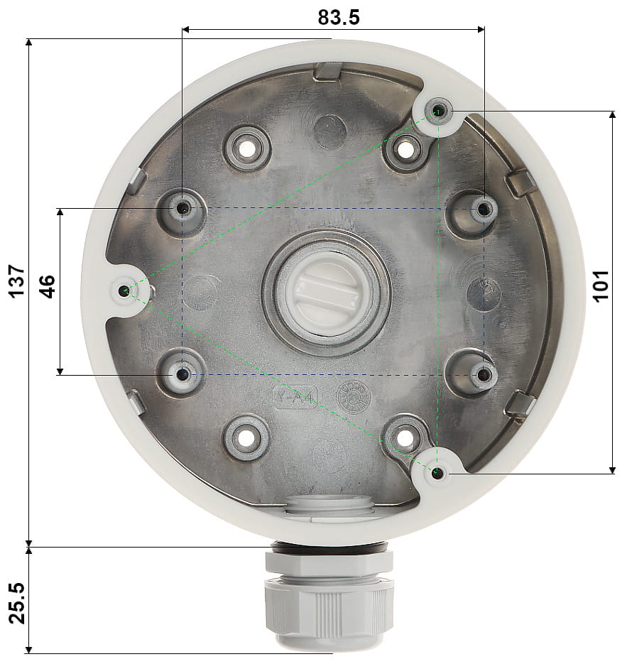 Można montować na nim kamery wandaloodporne. Posiada bardzo przydatną możliwość ukrycia kabli i złącz wychodzących z kamery.
