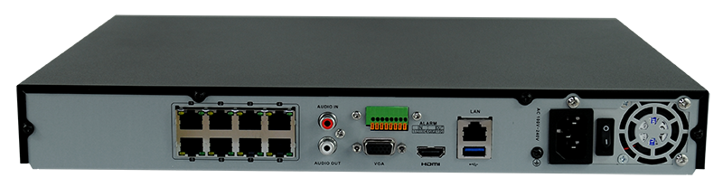 Model NVR-2082-P wyposażono dodatkowo w 8-portowy switch z obsługą technologii PoE oraz zasilania 240 V AC. Technologia ta umożliwia dostarczenie do kamery zasilania oraz pozwala na przesłanie pakietów danych z monitoringu za pomocą jednego przewodu.
