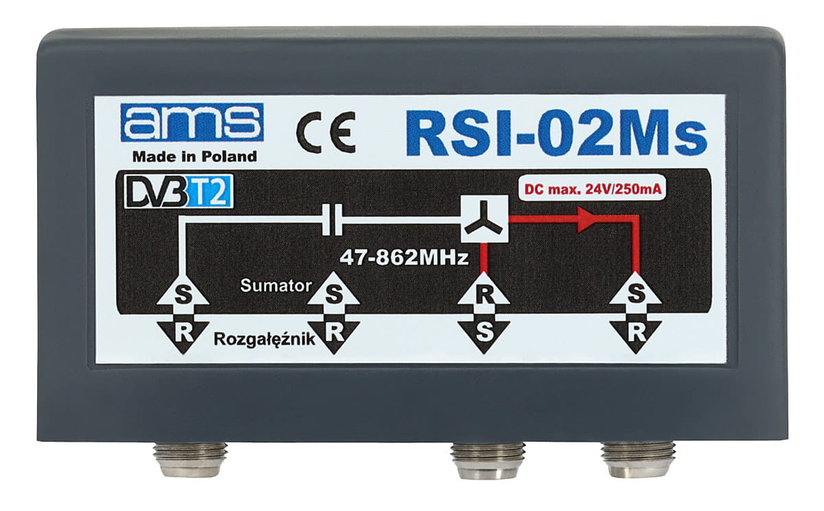 Urządzenie RSI-02Ms pracuje jako sumator lub rozgałęźnik sygnałów radiowo-telewizyjnych w zakresie częstotliwości 47-694 MHz. Sumator jest przystosowany do pracy w otwartej przestrzeni i może być montowany na maszcie antenowym za pomocą opaski zaciskowej.