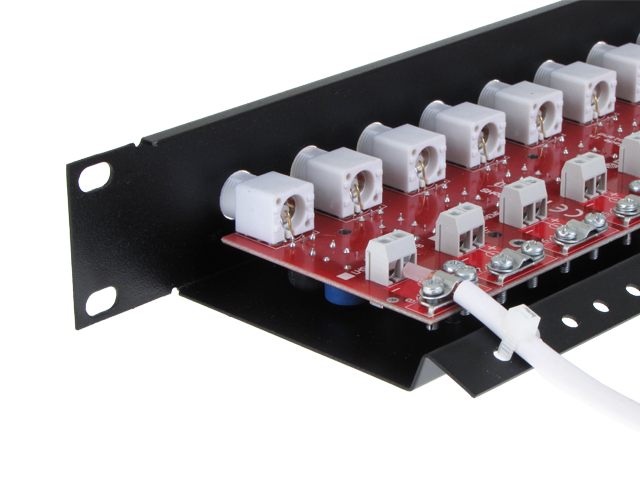 Panel może być zamontowany na przedniej lub tylnej szynie szafy RACK. Po zastosowaniu kątowych uhwytów LK-MOUNT panel pochylony jest pod kątem 45 stopni, co umożliwia latwy dostęp zarówno do gniazd BNC jak i do złącz przewodów wchodzących od strony kamer, ponadto ładogne opadanie przewodów nie powoduje ich łamania i zwiększa trwałość. Przy ustawieniu kątowym, bardzo łatwo zamontować jest wiele paneli bez ograniczania dostępu do jakichkolwiek połączeń.
