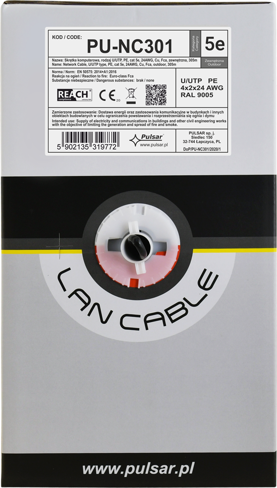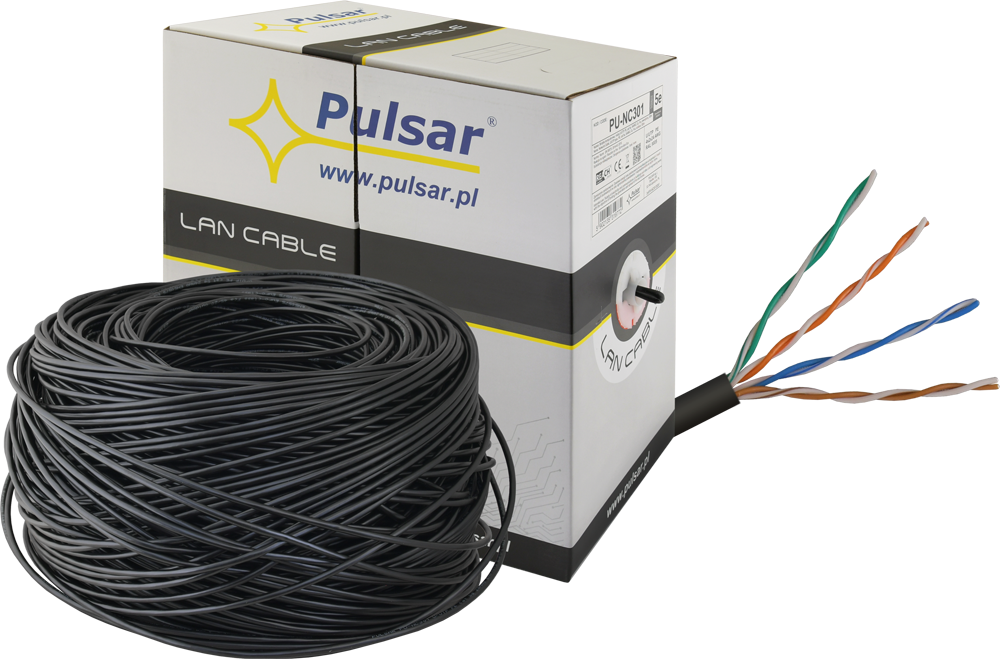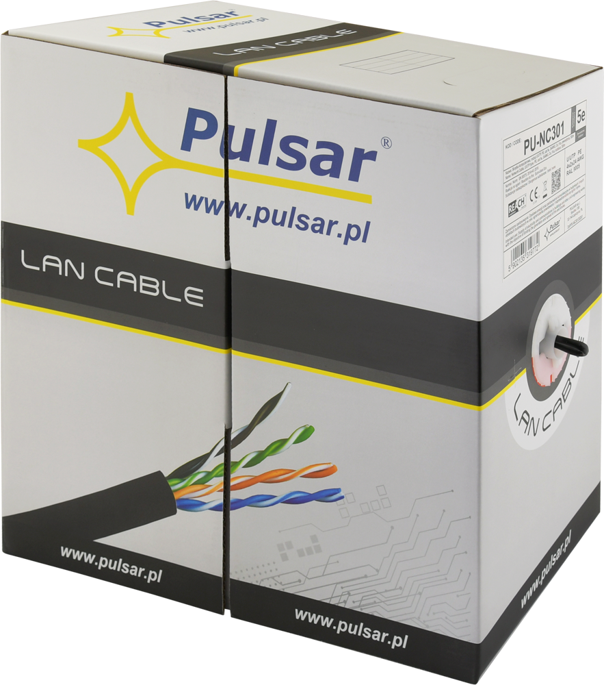 PU-NC301 to skrętka komputerowa LAN U/UTP kat.5e, marki Pulsar. Model może być wykorzystany do instalacji zewnętrznych (powłoka PE, brak żelu), jest zgodny z normą PN-EN 50575 (CPR). Żyły wykonane z miedzi (Cu 99,99%). Długość 305m, opakowanie: karton.