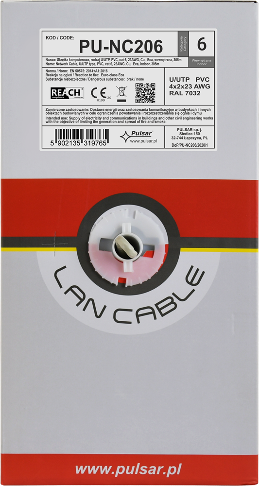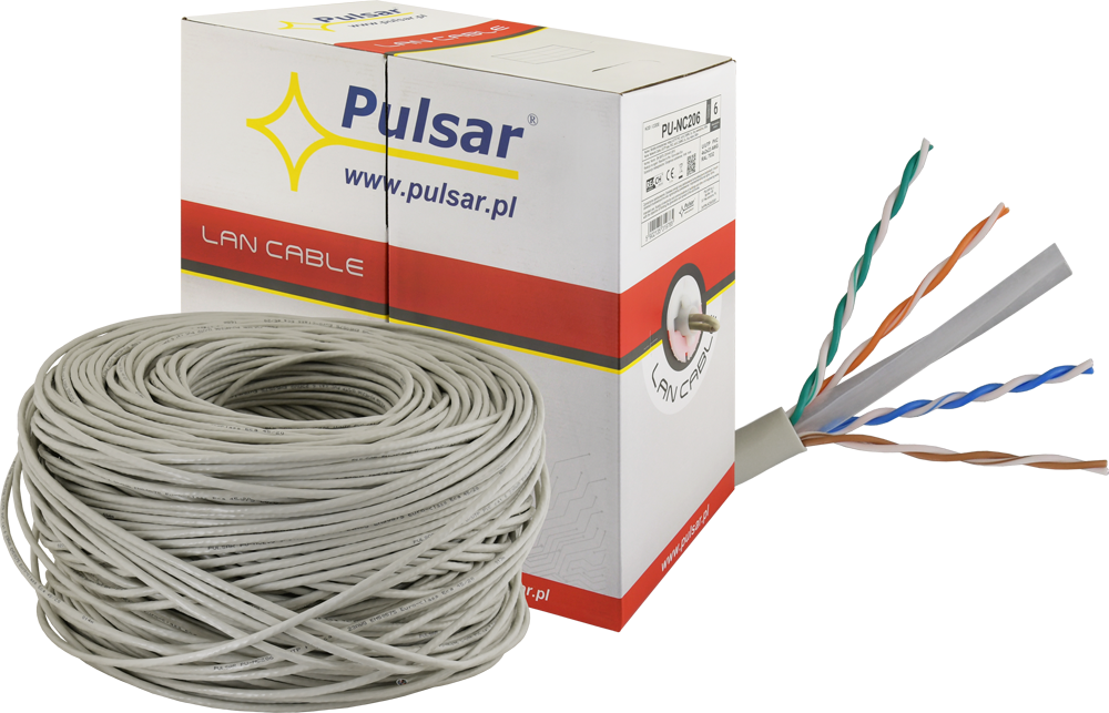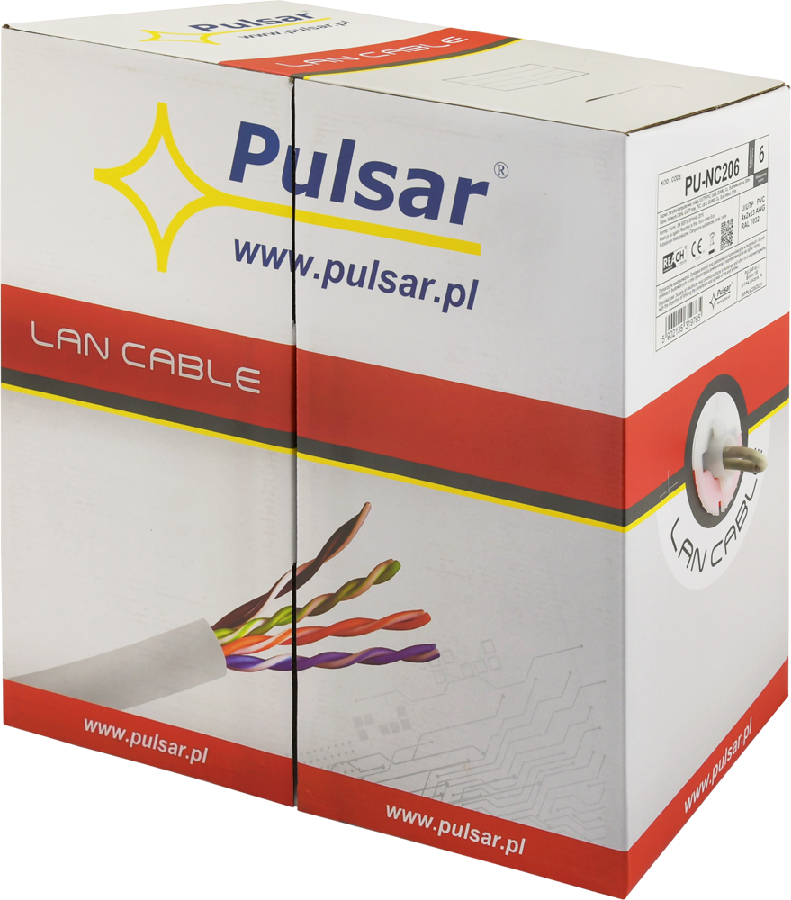 PU-NC206 to skrętka komputerowa LAN U/UTP kat.6, marki Pulsar. Model przeznaczony jest do instalacji wewnętrznych, jest zgodny z normą PN-EN 50575 (CPR). Żyły wykonane z miedzi (Cu 99,99%). Długość 305m, opakowanie: karton.