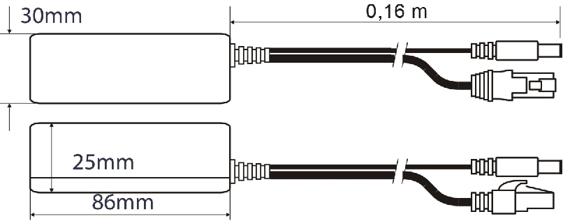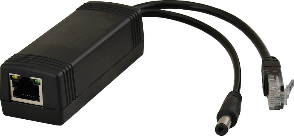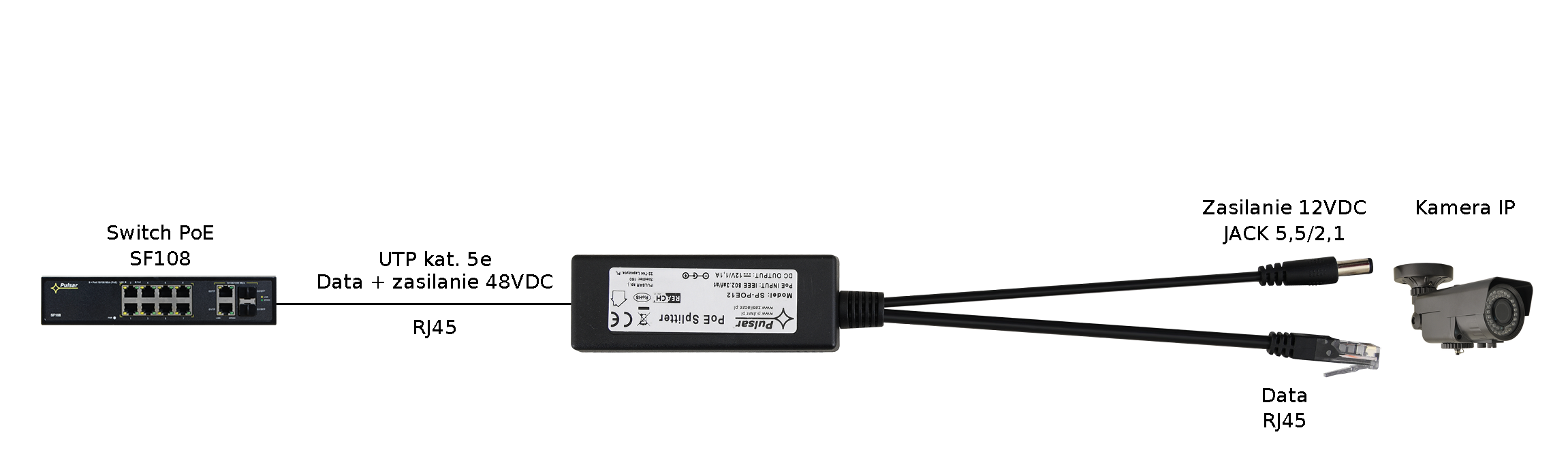 Na wejście modułu (gniazdo RJ-45) podawane jest napięcie zasilania (POWER) oraz dane (DATA). Na wyjście (wtyk RJ-45) przesyłane są jedynie dane (DATA), natomiast napięcie zasilania 12V DC do kamery 12V dostępne jest na wtyku DC 5,5/2,1. Splitter pozwala również na zasilanie innych urządzeń wymagających napięcia zasilającego 12V DC takich jak: Acces Point, router itp...