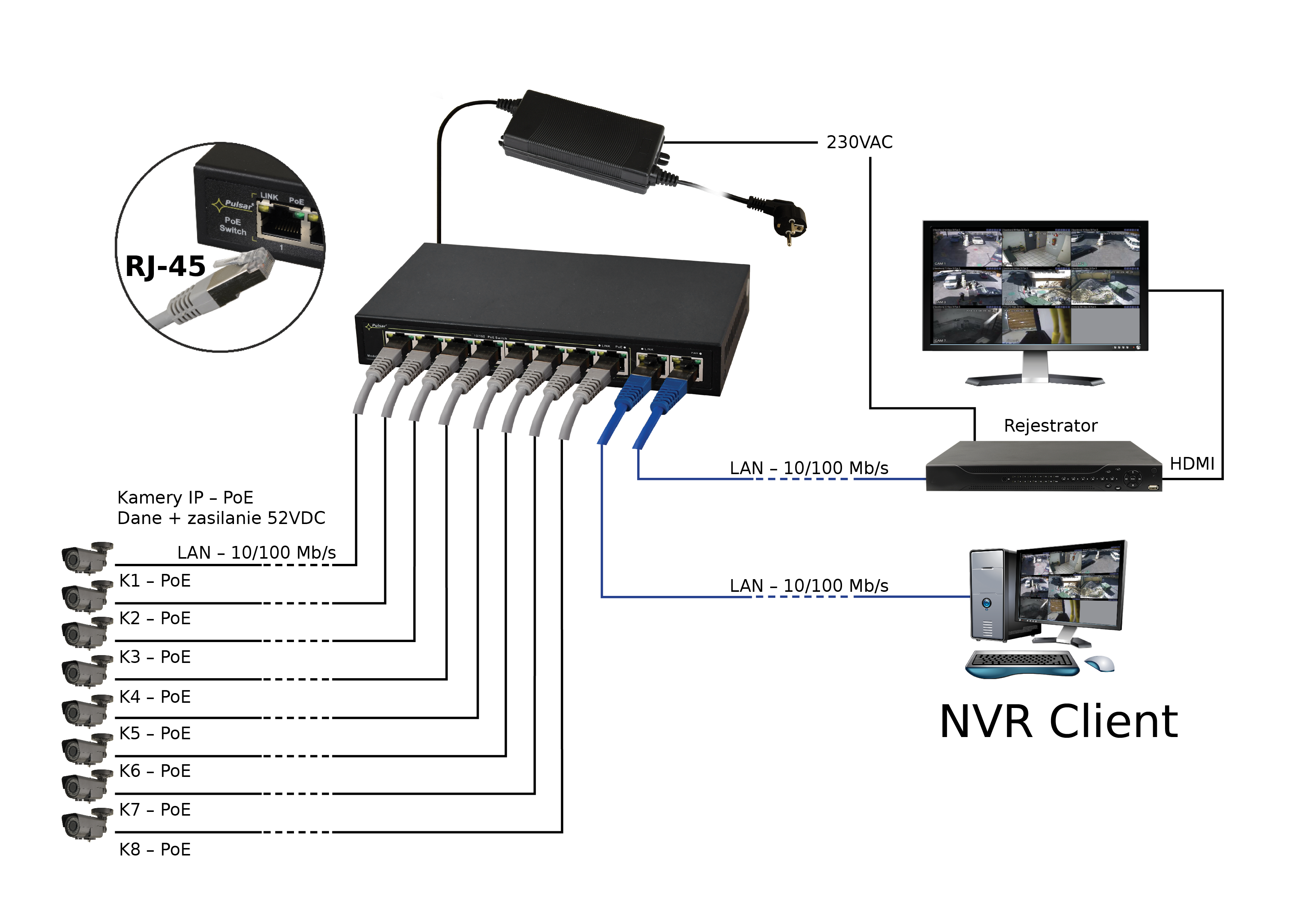 Technologia PoE zapewnia połączenie sieciowe oraz obniża koszty instalacji, eliminując potrzebę doprowadzania oddzielnego kabla zasilającego do każdego urządzania. Oprócz kamer w ten sposób mogą być zasilane urządzenia sieciowe, które korzystają z tej technologii np. telefon IP, access point, router.