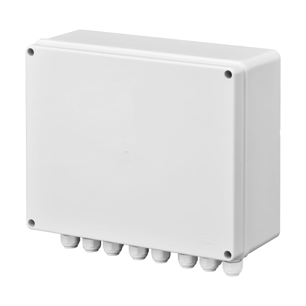 | Obudowa: | Obudowa BCS-L2, Materiał bezhalogenowy, odporny na promieniowanie UV, Kolor szary (RAL7035), Zamontowana płyta z otworowaniem systemowym 4,8 mm w rastrze 10,8 mm, Zamontowane dławnice 10 x M16, 1 x M20 |