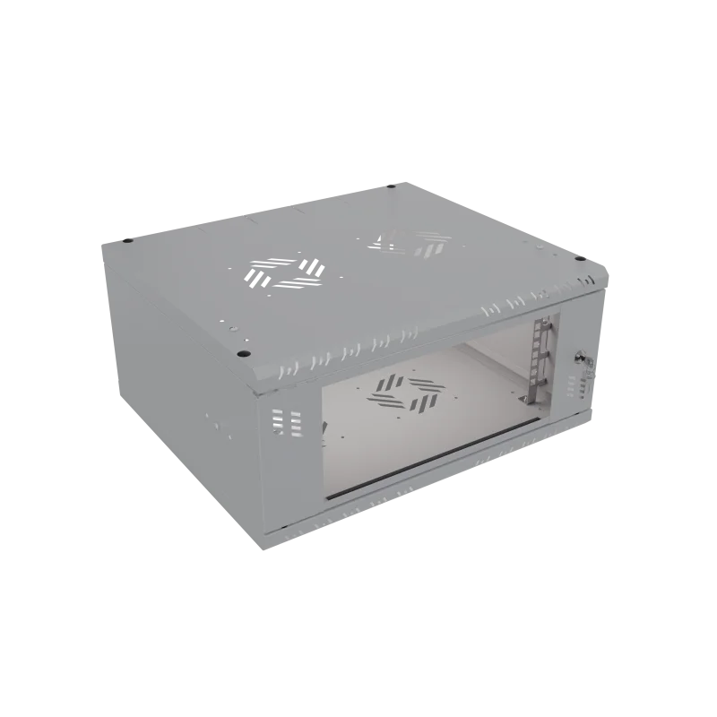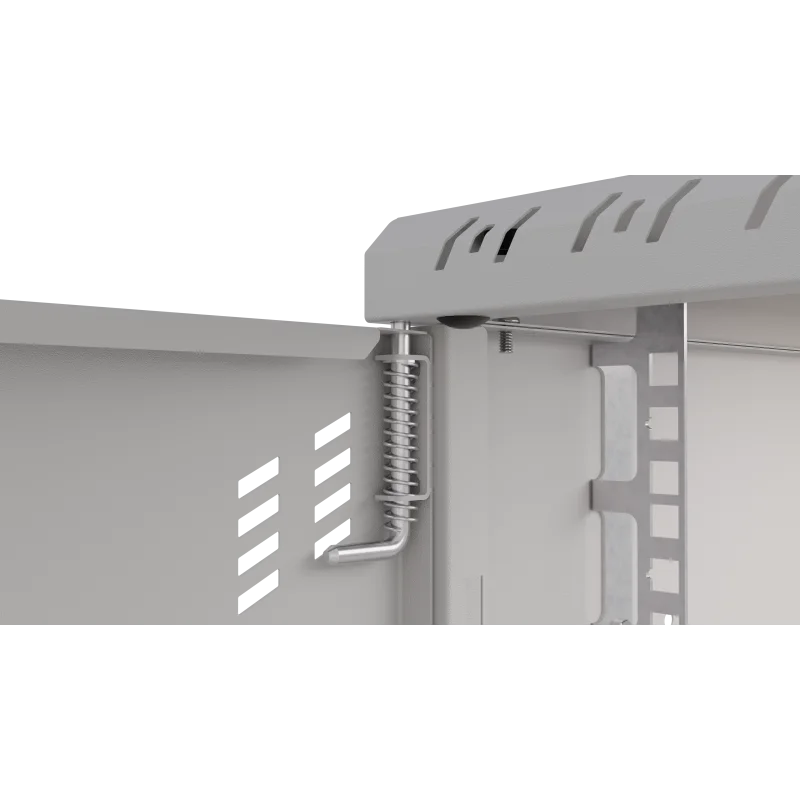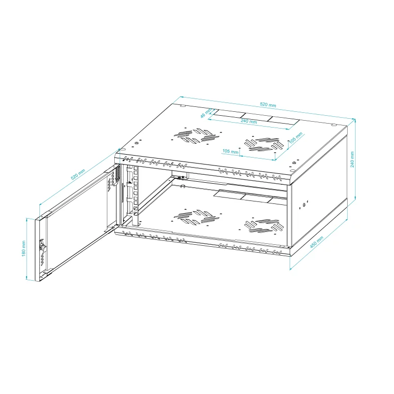 Szafę można łatwo przykręcić za pomocą kołków rozporowych (nie znajdują się w zestawie) dzięki otworom w tylnej części. Szafa umożliwia czteropunktowy montaż do ściany, co zwiększa jej stabilność. Drzwi można zamontować zarówno po prawej, jak i lewej stronie, a dzięki specjalnym zawiasom ze sprężyną ich montaż i demontaż jest niezwykle prosty. Szyny RACK można zamontować na trzech głębokościach, co pozwala na swobodne dopasowanie do urządzeń wewnątrz. W górnej i dolnej części znajdują się miejsca na wentylatory 120x120 mm (rozstaw otworów 105x105 mm), co zapewnia odpowiednie chłodzenie urządzeń. Dodatkowo, wyłamywane przepusty kablowe 50x80 mm (3 sztuki w górnej i 3 sztuki w dolnej części) ułatwiają zarządzanie okablowaniem. Szafa jest wyposażona w perforacje od frontu i po bokach, co jest kluczowe dla odprowadzania ciepła.
