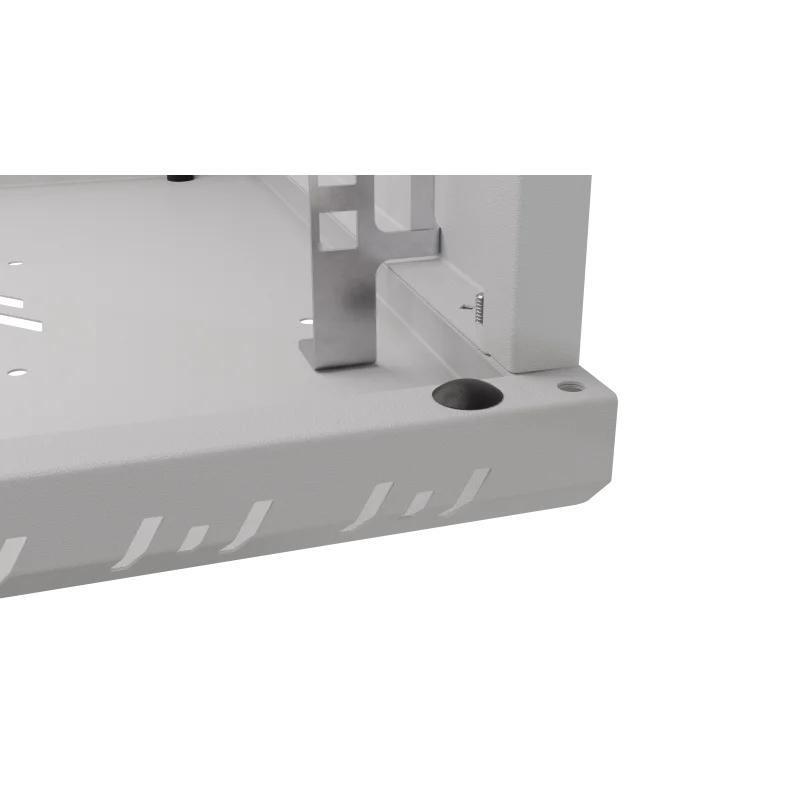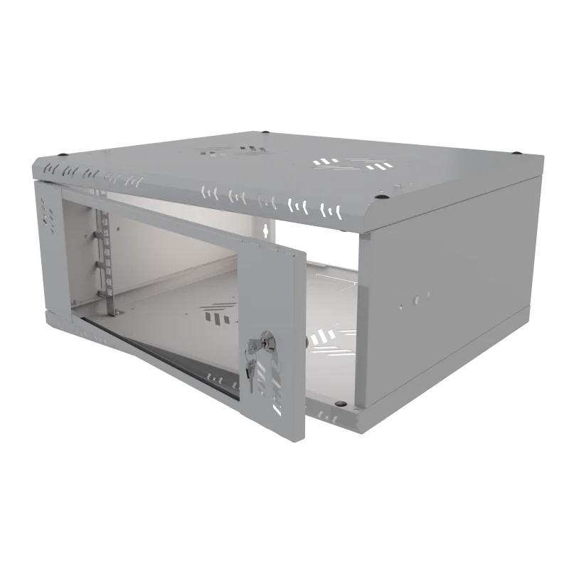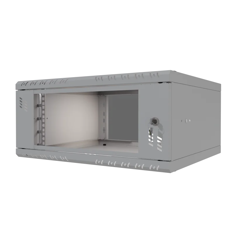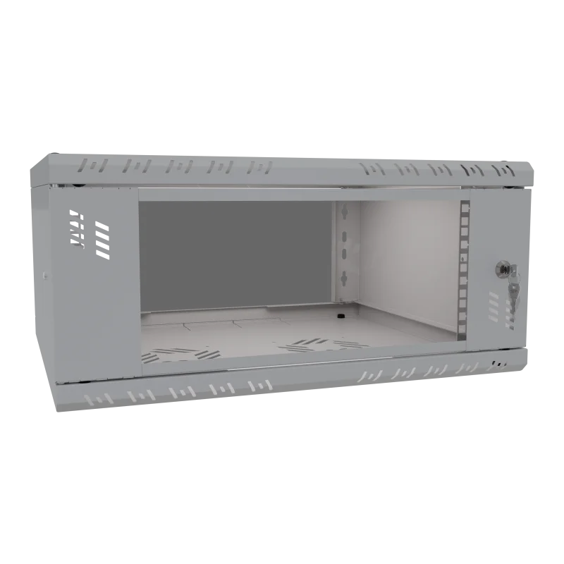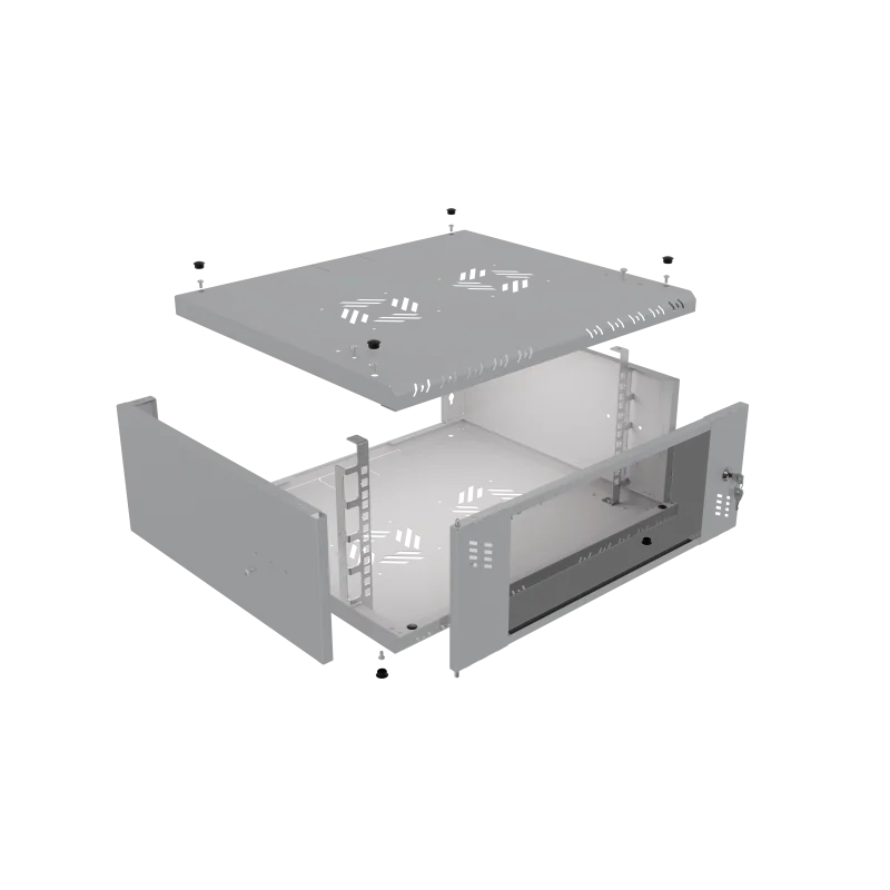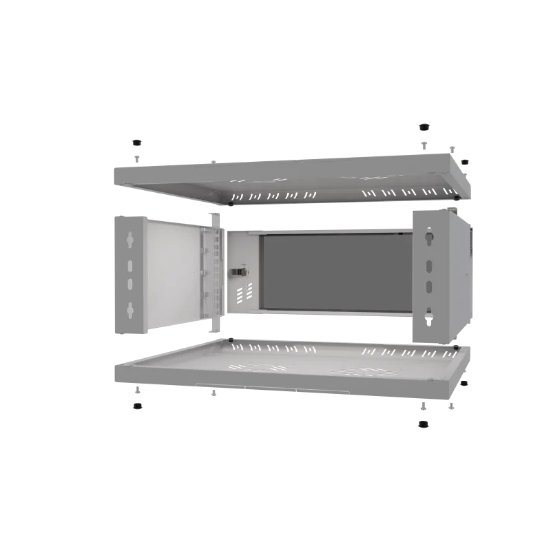 Szafa wykonana jest z blachy, która gwarantuje sztywność, a jednocześnie jest na tyle lekka, że jedna osoba może przeprowadzić instalację. Celowe usunięcie tylnej ściany umożliwia wygodną modernizację oraz zapewnia łatwy dostęp do okablowania wychodzącego ze ściany. Liczne otwory w szynach RACK pozwalają na łatwe przeprowadzenie okablowania. Dzięki swojej kompaktowej szerokości wynoszącej zaledwie 520 mm, szafa idealnie nadaje się do miejsc o ograniczonej przestrzeni, pozostając w pełni funkcjonalną.