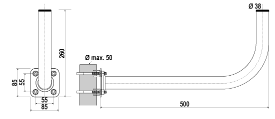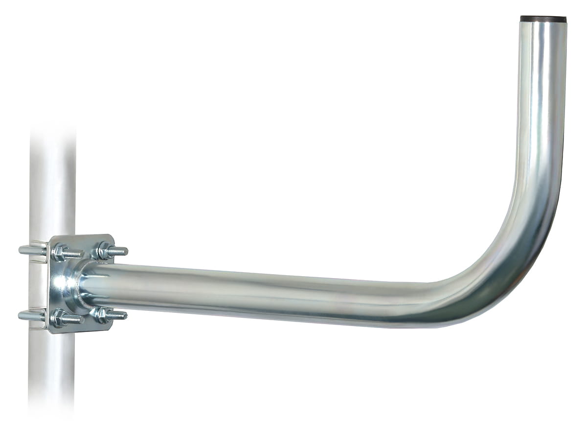 Uchwyt UR-38Z50 pasuje na maszt o średnicy nie większej niż 50 mm. W komplecie są 2 cybanty M8 (jak widać na zdjęciu). Możliwy jest również montaż pionowy (jako przedłużenie istniejącego masztu). W tym celu cybanty należy umieścić poprzecznie.