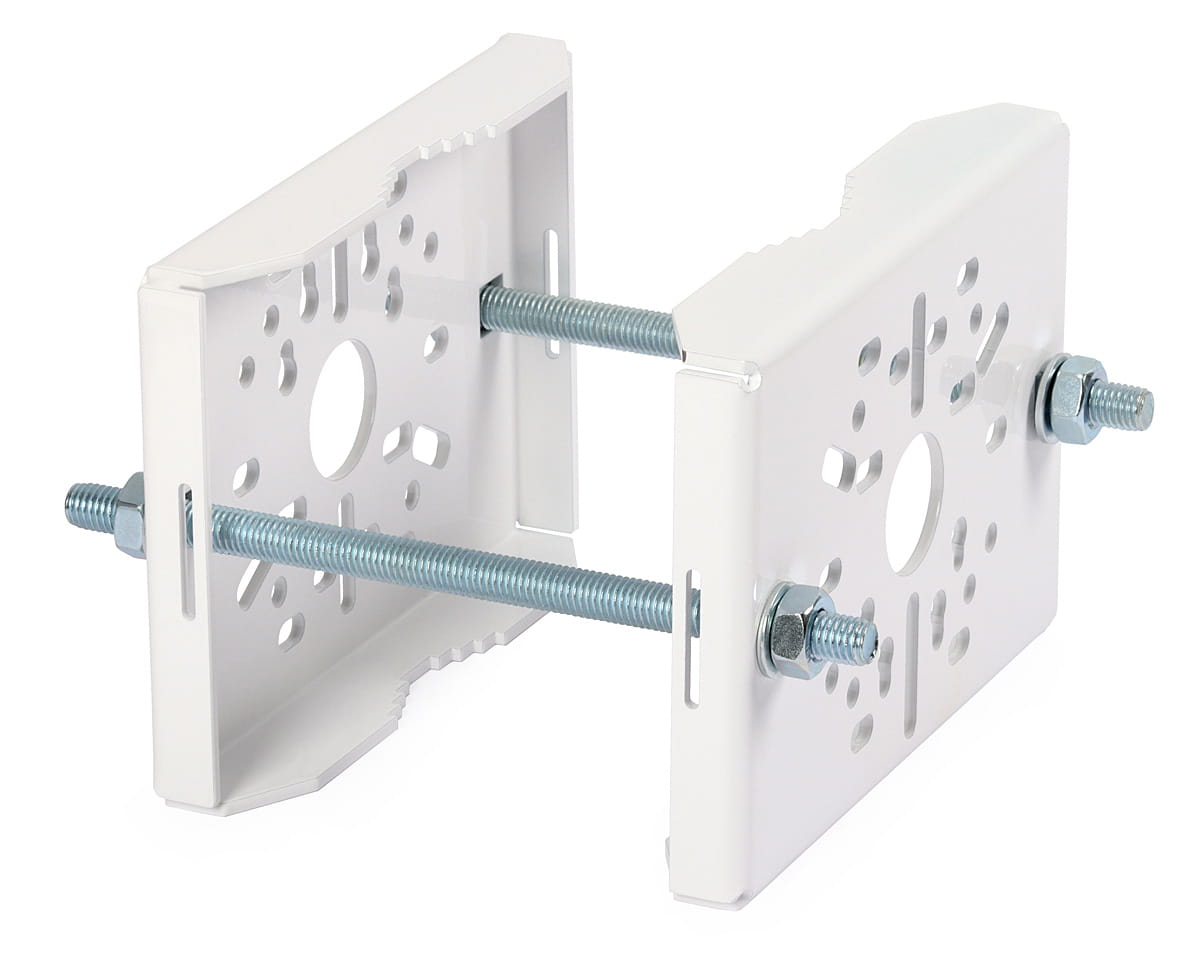 Uchwyt Marathon MK-61W służy do montażu kamer na maszcie lub latarni o maksymalnej średnicy Ø105 mm. Wykonany jest z blachy stalowej ocynkowanej o grubości 3 mm malowanej proszkowo. Pozwala na montaż jednej lub dwóch kamer - po obu stronach masztu. Posiada wiele, uniwersalnych otworów montażowych, co sprawia, że jest kompatybilny z większością kamer. W komplecie znajdują się: dwa uchwyty oraz dwie śruby z podkładkami i nakrętkami.