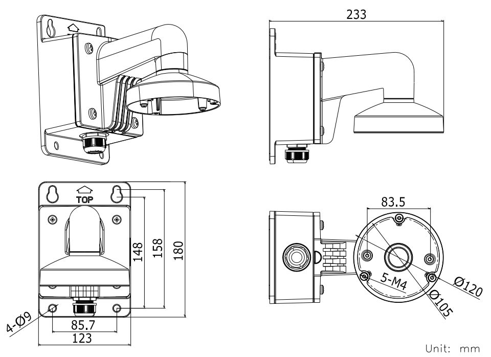 Metalowy uchwyt ścienny Hikvision z puszką przyłączeniową do montażu kamer: serii DS- 2CD25xx, DS-2CD7153-E, DS-2CD7164-E, DS-2CS58A1P-IRS i DS-2CS54A1P-IRS.