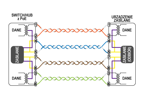 Zasilacz pracuje według opcji B standardu, tj. zasilanie przesłane jest przez wolne pary 4/5 oraz 7/8.