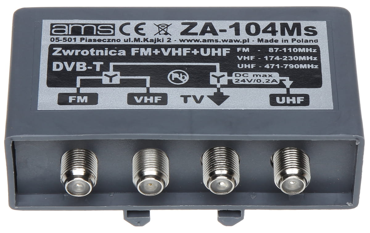 Zwrotnica ZA-104Ms trzywejściowa stosowana jest jako element sumujący sygnały z trzech anten: FM (87-110 MHz), VHF (170-230 MHz) oraz UHF (470-862 MHz), montowana na maszcie antenowym, w pobliżu zestawu antenowego. Zwrotnica ZA-104M przeznaczona jest do pracy w otwartej przestrzeni. Konstrukcja obudowy zapobiega przedostawaniu się deszczu do wnętrza zwrotnicy. Prosty montaż na maszcie dzięki plastikowej opasce.